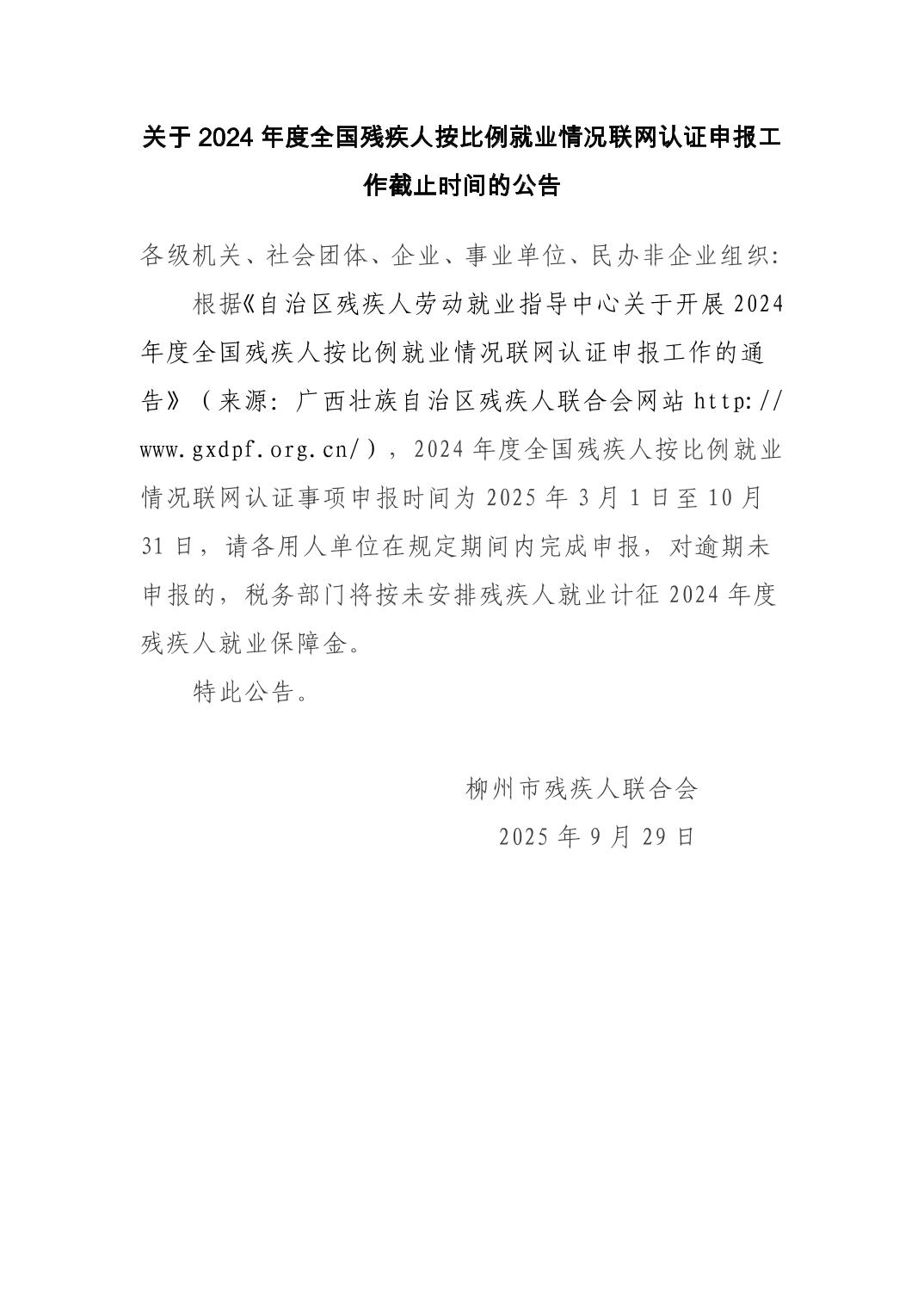 关于2024年度全国残疾人按比例就业情况联网认证申报工作截止时间的公告